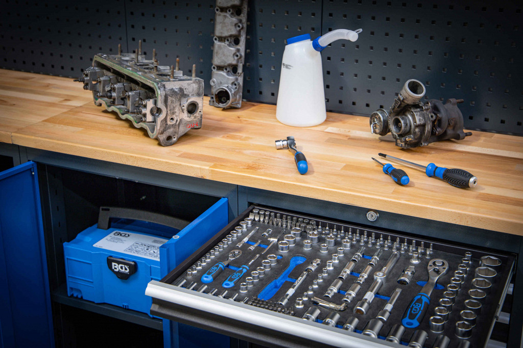 Za postavitev servisnega centra, delavnice v tovarnah in podjetjih ali lastne garažne delavnice na domumodularni sistem za shranjevanje stenskih enot kombinacija samonosilna konstrukcijabrez dodatne pritrditvedelovni prostor je opremljen z delovno ploščo iz masivnega lesa debeline 30 mmintegrirani delavniški voziček, mobilen, kot nalašč za mobilno uporabo in prostorsko varčno shranjevanjes perforirano strukturo stenskih plošč za individualno in pregledno shranjevanje orodja predali s samozapiralnim sistemomstenske omare z Amortizerji za gladko odpiranje in zapiranjePonuja dodatne možnosti shranjevanja za optimalno uporabo delovnega prostoraz modulom za smeti, vključno z nihajno loputo in prostorom za vgradnjo koša za smetiSkladišče za papirne brisače (za zvitke papirnatih brisač 270 x 270 mm) za dodatno namestitev za zvitek papirnatih brisačVišinsko nastavljive in individualno uporabne policePosamično zaklepljivi elementi za preprečevanje nepooblaščenega dostopaVse omare z višinsko nastavljivimi nogamiPrilagojena postavitev lastne delavnice opremo, s kombinacijo z drugimi elementi. širina predala (notranja dimenzija): 567 mm globina predala (notranja dimenzija): 408 mm višina predala (notranja dimenzija): 10 x 48,5 mm | 2 x 118 mm | 2 x 190 mm debelina stene telesa: 0,8 - 1,2 mm. 3 stenske omare s sprednjim zavihkom, nosilnost do 30 kg2 delavniška omara 2 vrati, z 1 polico, nosilnost do 80 kg2 delavniška omara 2 vrati, z 2 policama, nosilnost do 80 kg1 talna omara, s 7 gladkimi predali s krogličnimi ležaji, nosilnost do 25 kg (vsak predal)1 voziček za orodje, s 4 predali z obratom6 perforiranih stenskih plošč1 spodnja omarica z držalom za papirnate brisače in modulom za smeti, nosilnost do 80 kg, zaklepanje1 delovna plošča iz masivnega lesa, 1950 x 550 x 30 mm, nosilnost do 250 kg/m²12 ključev (2 za vsak element)