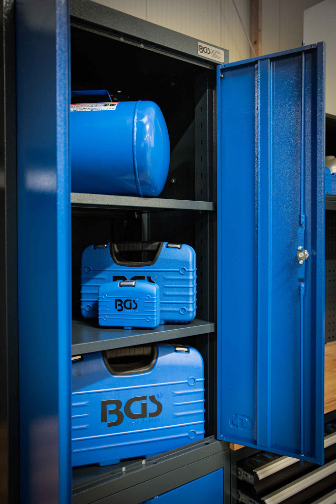 Za postavitev servisne delavnice, v tovarnah in podjetjih ali lastne garažne delavnice na domumodularni sistem za shranjevanje stenskih enot kombinacija samonosilna konstrukcijabrez dodatne pritrditvedelovni prostor je opremljen z delovno ploščo iz masivnega lesa debeline 30 mm s perforirano strukturo stenskih plošč za individualno in pregledno shranjevanje orodijpredali s samozapiralnim sistemomstenske omare z amortizerji za gladko odpiranje in zapiranjeponuja dodatne možnosti shranjevanja za optimalna izkoriščenost delovnega prostoraz modulom za smeti vključno z nihajno loputo in prostorom za vgradnjo koša za smeti povodnik za papirne brisače (za papirnate brisače 270 x 270 mm) za dodatno namestitev za zvitek delavniških papirnatih brisač, višinsko nastavljive in individualno uporabne policeindividualno zaklepljivi elementi za preprečevanje nepooblaščenega dostopavse omare z višinsko nastavljivimi nogamiprilagojena postavitev lastne delavniške opreme, s kombinacijo z drugimi elementi, vključno z drugimi. LED svetlobni elementi .. širina predala (notranja dimenzija): 567 mm globina predala (notranja dimenzija): 408 mm višina predala (notranja dimenzija): 10 x 48,5 mm | 2 x 118 mm | 2 x 190 mm debelina stene telesa: 0,8 - 1,2 mm. 5 stenskih omaric s sprednjo loputo, nosilnost do 30 kg3 delavniška omara 2 vrata, z 1 polico, nosilnost do 80 kg1 delavniška omara 2 vrati, z 2 policama, nosilnost do 80 kg2 talne omare, s 7 gladkimi predali s krogličnimi ležaji, nosilnost do 25 kg (vsak predal)10 perforiranih stenskih plošč1 spodnja omarica z držalom za papirnate brisače in modulom za smeti, nosilnost do 80 kg, zaklepanje2 delovni plošči iz masivnega lesa, 1950 x 550 x 30 mm, 1300 x 550 x 30 mm, nosilnost do 250 kg/m²12 ključev (2 za vsak element)
