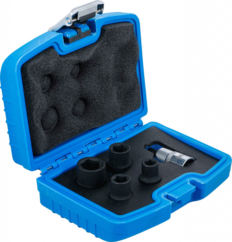 Komplet za demontažo zavornih čeljusti. Vsebuje petkotne nasadne ključe 10 mm, 12,5 mm, 14 mm (za čeljusti Mercedes-Benz, Smart, Opel Astra G in Zafira), 19 mm (za ročno zavoro Citroen, Renault, Peugeot) ter nasadni ključ 10 mm za zavore Girling.