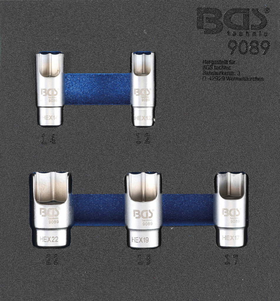 Za privijanje in odvijanje kolenskih priključkov tipa L, primerno za zračne sisteme tovornjakov, pnevmatske zavore in stroje, omogoča delo v ozkih prostorih, 5 odprtih nasadnih ključev 12–22 mm.