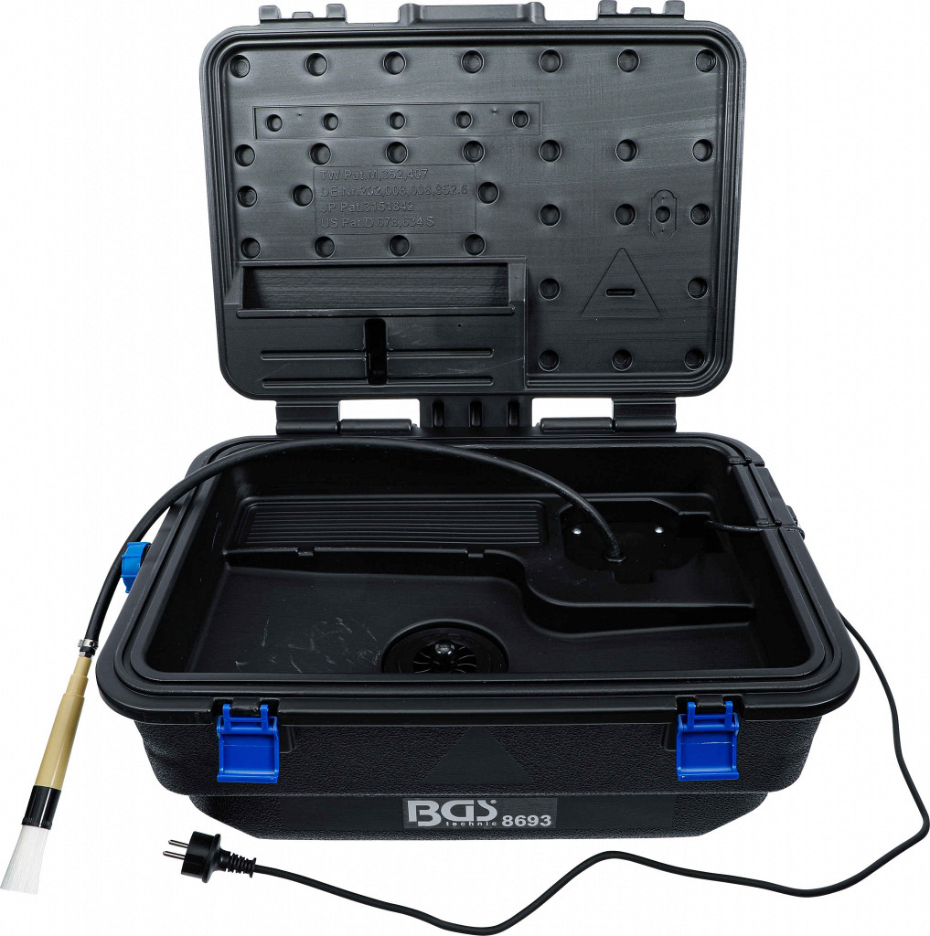 Pralna kad za čiščenje manjših delov, krtača se sproti izpira za boljši učinek čiščenja, primerna za vse rahlo alkalne vodotopne čistilce (npr. univerzalno čistilo 5 l BGS 9380), kapaciteta najmanj 15 litrov, mere (Š x G x V): 640 x 440 x 260 mm.