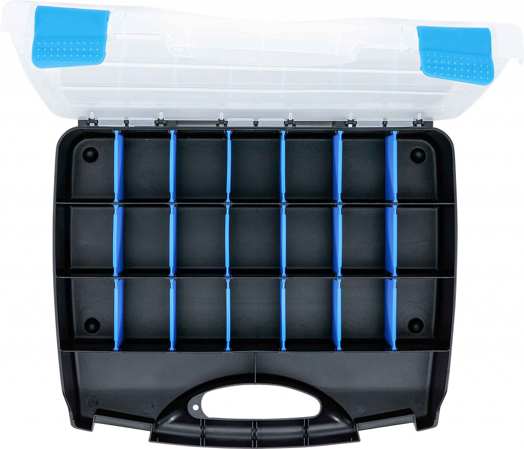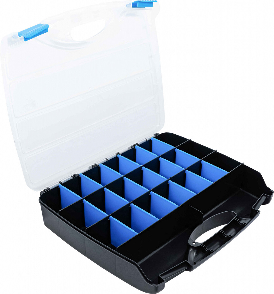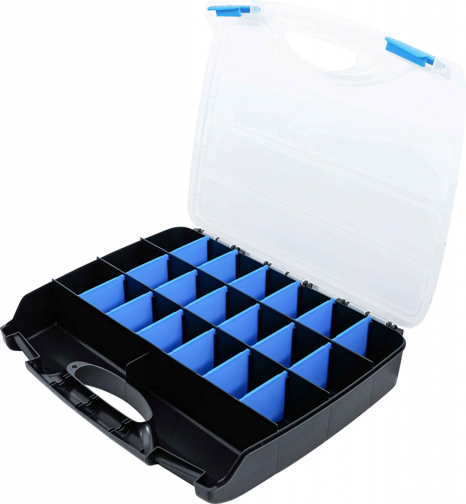 Škatla z 23 predali, z odstranljivimi pregradami za prilagodljive dimenzije, višina pregrad 60 mm.