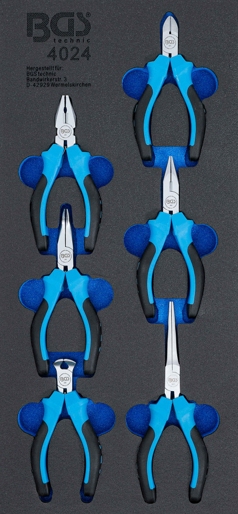 Vzmetno obremenjene klešče z 2-komponentnimi ročaji: kombinirane 115 mm, stranske 115 mm, podaljšane 130 mm, ukrivljene 125 mm, končne 110 mm, igelne 150 mm.