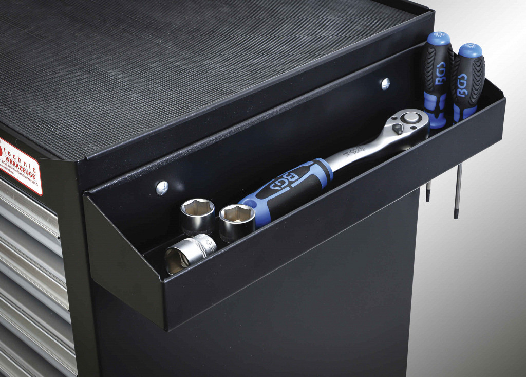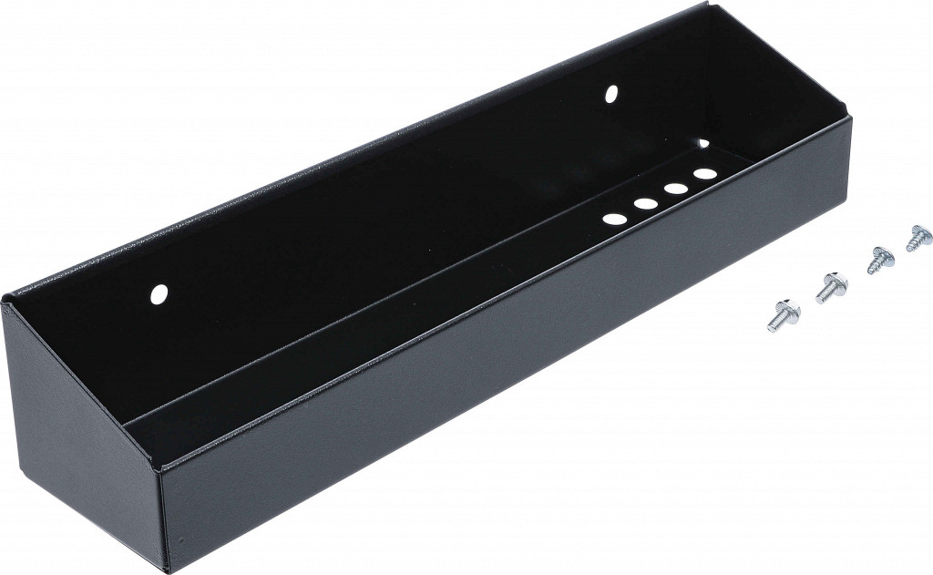 Primeren za vozičke BGS 2001, 4204, 4205, 4206. Za shranjevanje orodja, nasadnih ključev, izvijačev in drobnih delov. Z 8 luknjami za izvijače s premerom rezila do 11,8 mm, sploščena oblika za lažje jemanje orodja, za neposredno montažo na predpripravljene luknje, priloženi vijaki. Višina 1 (zunanja): 89 mm, višina 2 (zunanja): 52 mm.