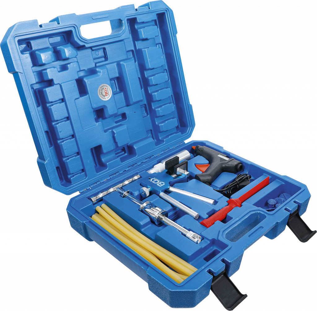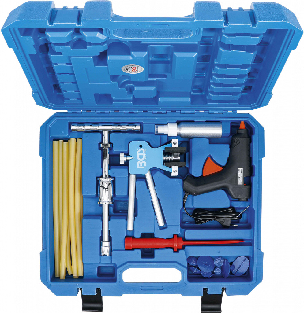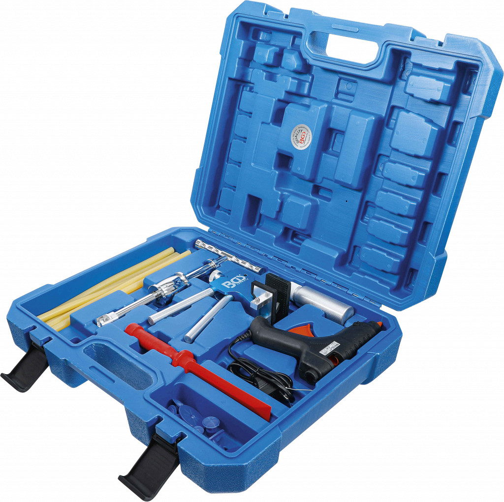 Komplet za popravilo manjših udrtin brez barvanja. Vsebina: pištola za vroče lepilo, 9 nastavkov za udrtine, lepilne palčke, izvlečni kladivo, enota z gumiranimi nogami, plastični strgalo.