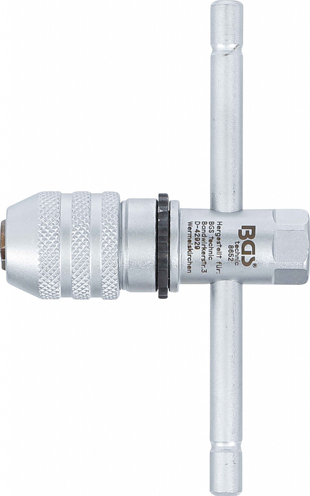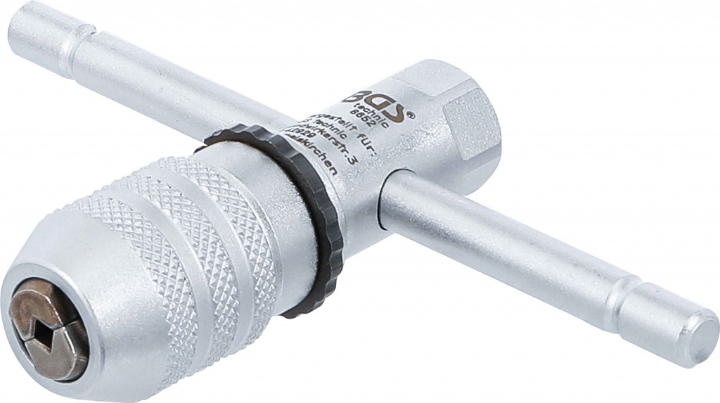 Nosilec za navojne svedre s funkcijo raglje levo/desno, primeren za M3–M10 (JIS, DIN, ISO, ANSI), uporaben s T-ročajem, 17 mm nasadnim ključem ali 3/8" ragljo.