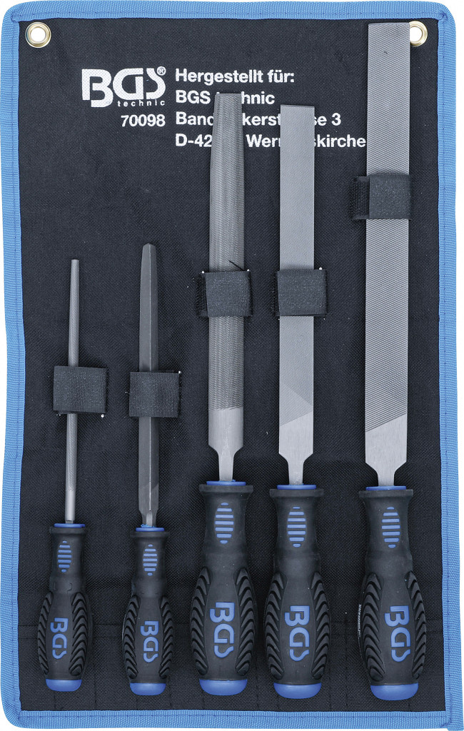 Komplet pil z varčnimi zobmi, univerzalno uporabne za obdelavo površin, odstranjevanje robov ipd., z nedrsečim dvokomponentnim ročajem, vsebuje ročno pilo 250 mm 1. rez, ročno pilo 200 mm 2. rez, polokroglo pilo 200 mm 1. rez, trikotno pilo 150 mm 2. rez in okroglo pilo 150 mm 1. rez.