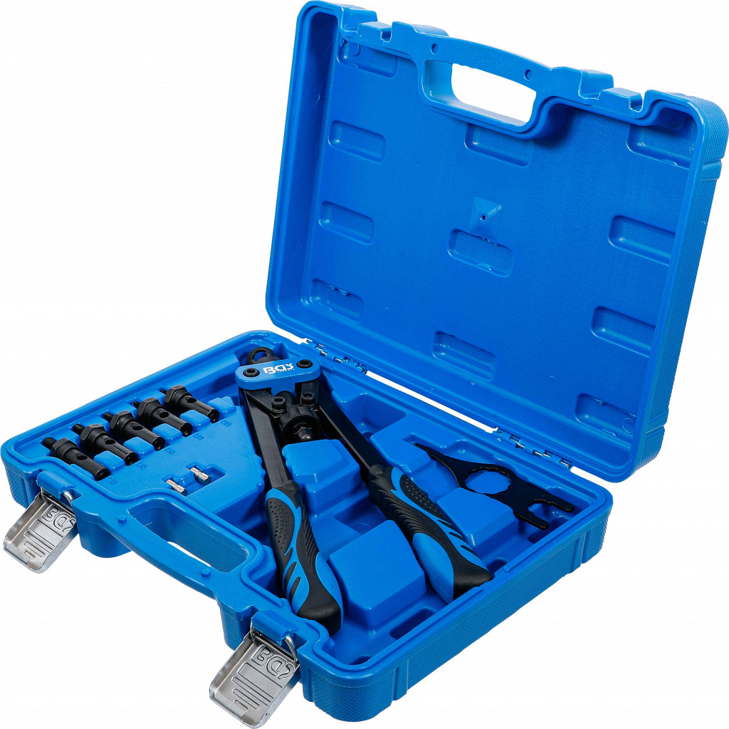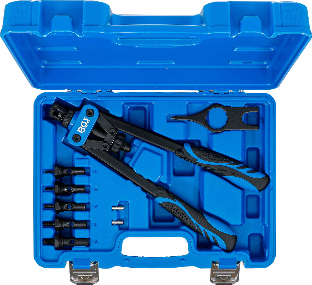 Klešče za vijačne matice M3–M8, z dvema ročicama in ergonomskimi ročaji; v kompletu nastavki za izvrtine Ø 5,0–11,0 mm in ključ za montažo.