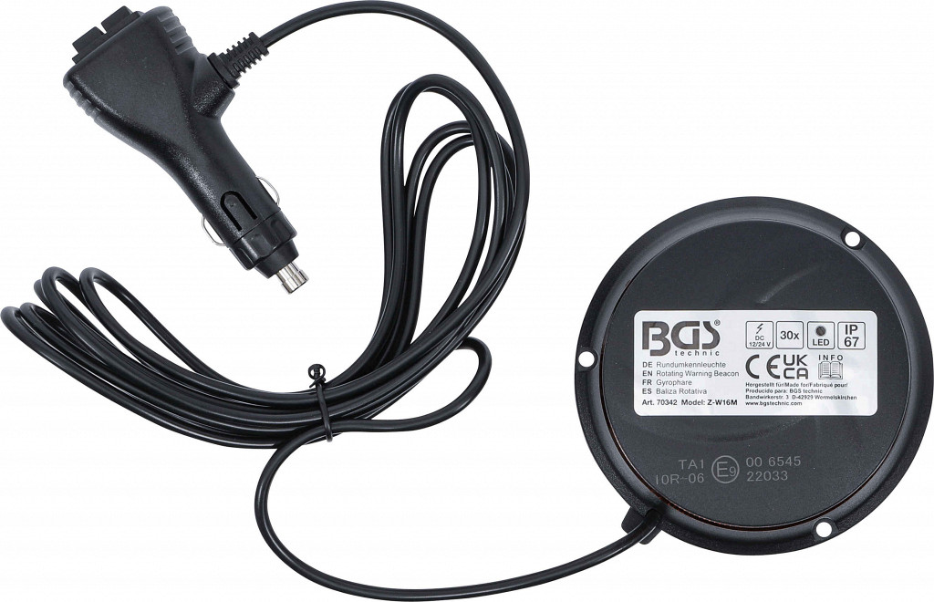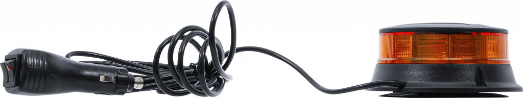 Rotacijska LED luč (rumena) z magnetno podlago ali priseskom. 360° osvetlitev s tremi načini utripanja in štirimi načini vrtenja. Odobrena z oznako ECE (E9). Napajanje DC 12–24 V, poraba 0,79 A pri 24 V, barva svetlobe 590–595 nm.