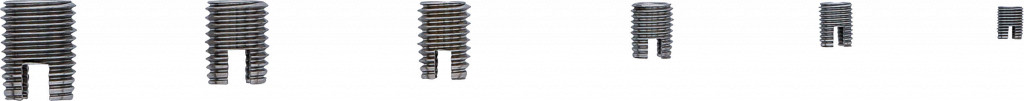 Set vložkov za popravilo in zmanjšanje navojev; s stransko režo in stožčasto obliko; samorezni vložki zagotavljajo trdno sidranje; priloženi vložki velikosti od M3x0.5 do M10x1.5. Obseg dobave: