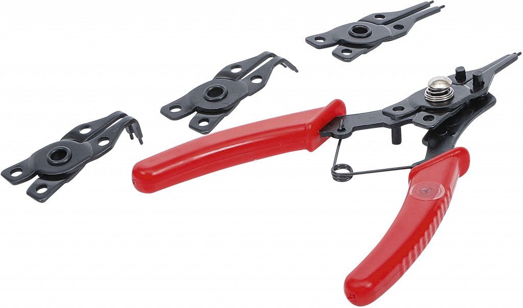 Klešče s 4 zamenljivimi glavami za notranje in zunanje varnostne obročke, dolžina 160 mm, glavi ravni (zunanja in notranja), glava ukrivljena 45°, glava ukrivljena 90°.