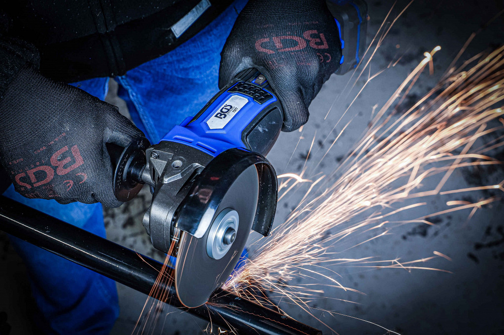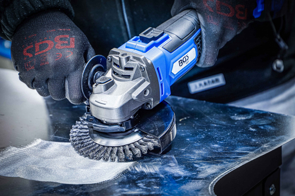 Akumulatorski kotni brusilnik set 18 V z brezkrtačnim motorjem, regulacijo hitrosti (3000–10000 vrt/min), možnostjo ročaja v treh položajih, primerno za diske Ø 125 mm, LED osvetlitvijo in mehkim ročajem; priložena litij-ionska baterija 4,0 Ah, hitri polnilec 4,0 A in univerzalna torba za orodje.