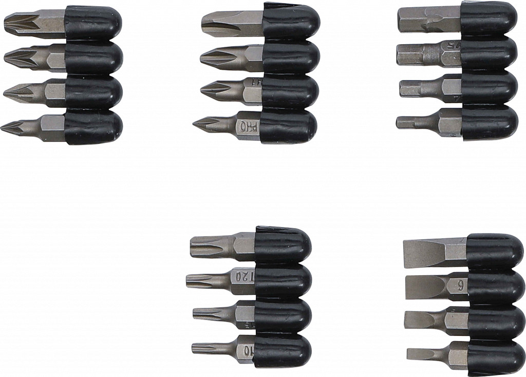 Set vsebuje nastavke SL 3–7 mm, PH0–PH3, PZ0–PZ3, Torx T10–T30, imbus 3–6 mm.