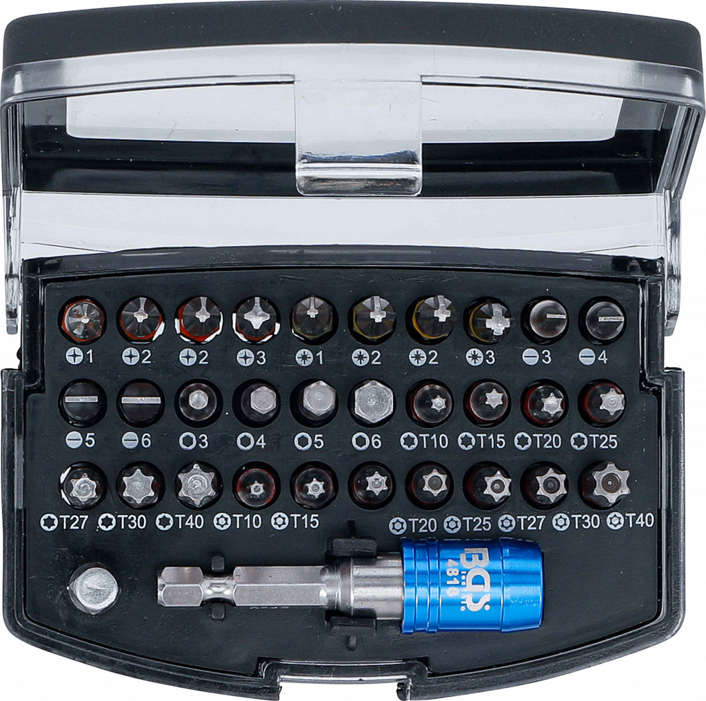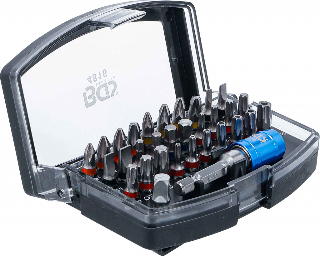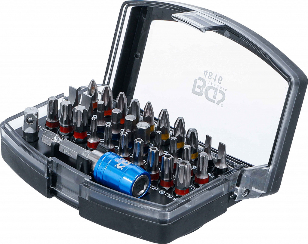 Pametni barvni sistem, ena barva za vsak profil. Vsebuje 30 nastavkov dolžine 25 mm (ploščati, PH, PZ, imbus, Torx in tamperproof Torx), adapter ter hitro vpenjalno držalo.