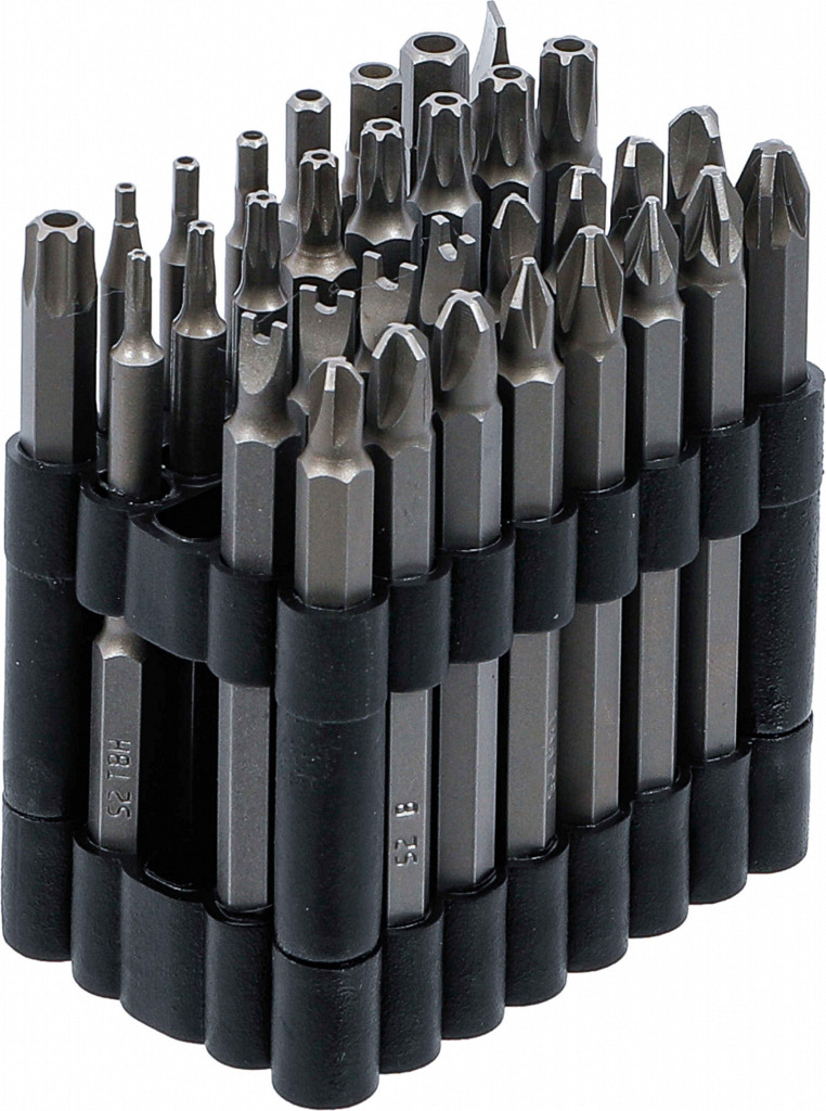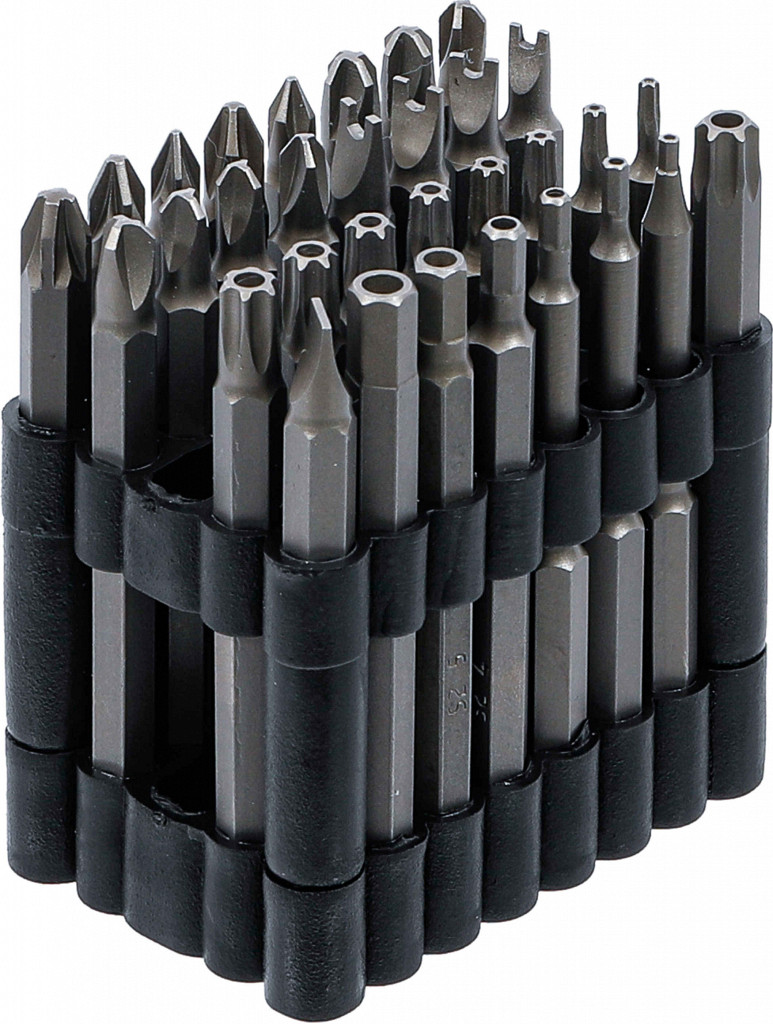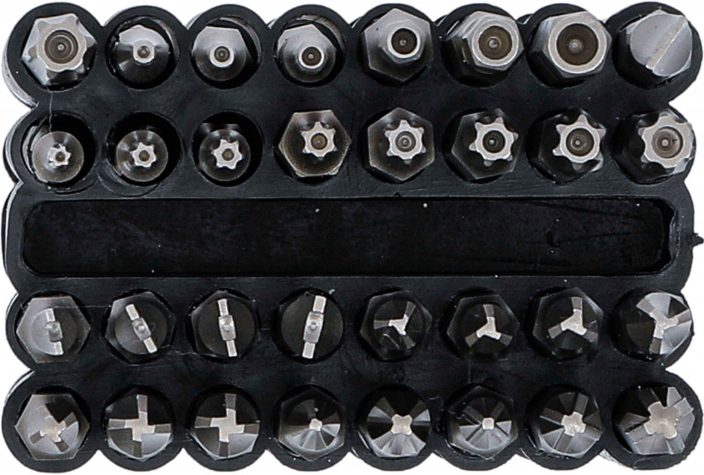Komplet varnostnih bitov za električne vrtalnike. Vsebina: 9 T-Star tamperproof T8–T40, 6 imbus tamperproof 2–6 mm, 3 štirikrilni offset 6–10 mm, 4 vilasti 4–10 mm, 4 trikrilni 1–4, 3 križni PZ1–PZ3, 2 križni PH1–PH2, 1 ploščati SL6 mm.