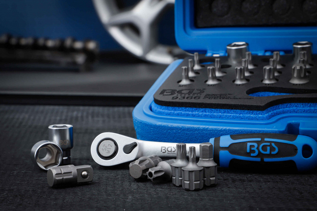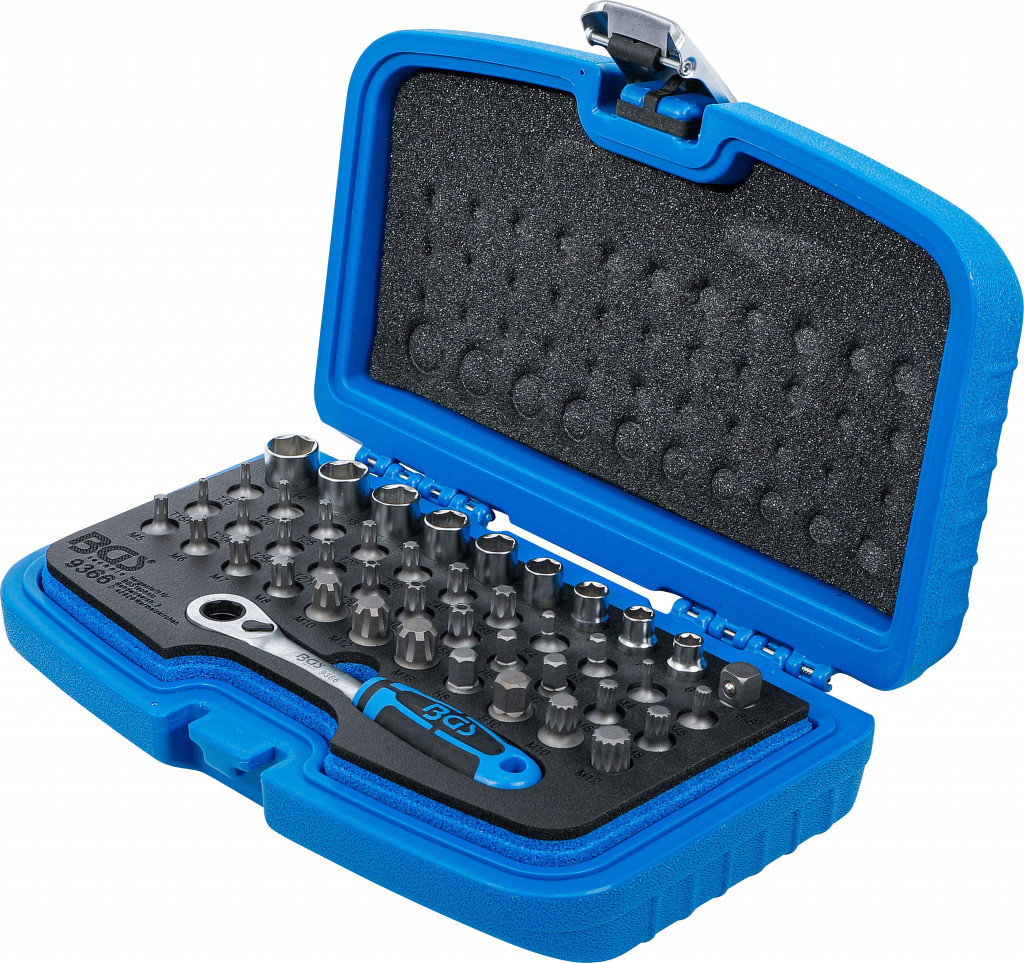 Komplet posebej primeren za vijačne spoje z dolgim navojevanjem (npr. navojne palice), brez omejitve globine kot pri običajnih nasadnih ključih, dolžina nastavkov in bitov 25,5 mm, material krom-vanadij jeklo (nasadni ključi) in S2 (biti), vsebuje reverzibilni raglja ključ s potisnim mehanizmom 72 zob, 6-robne nasadne ključe 6–14 mm in 33 specialnih profilnih bitov (Spline XZN, RIBE, Torx, Torx tamperproof, imbus).