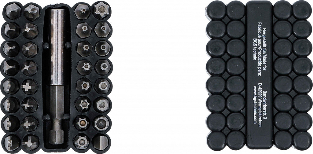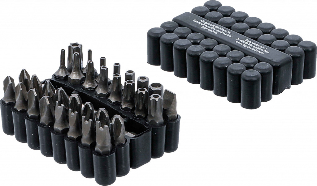 Komplet varnostnih bitov 25 mm za električne vrtalnike. Vsebina: 9 T-Star tamperproof T8–T40, 6 imbus tamperproof 2–6 mm, 3 štirikrilni offset 6–10 mm, 4 vilasti 4–10 mm, 4 trikrilni 1–4, 3 križni PZ1–PZ3, 2 križni PH1–PH2, 1 ploščati SL6 mm, 1 magnetno držalo 6,3 mm (1/4").