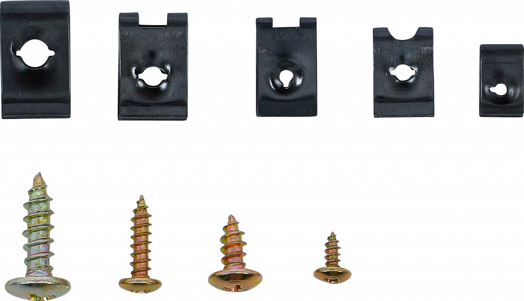 Komplet vijakov in sponk v plastični škatli: 40 vijakov 3 x 8 mm, 20 vijakov 4 x 16 mm, 15 vijakov 5 x 12 mm, 10 vijakov 6 x 20 mm, 85 sponk blatnikov/karoserijskih matic v različnih velikostih in oblikah.