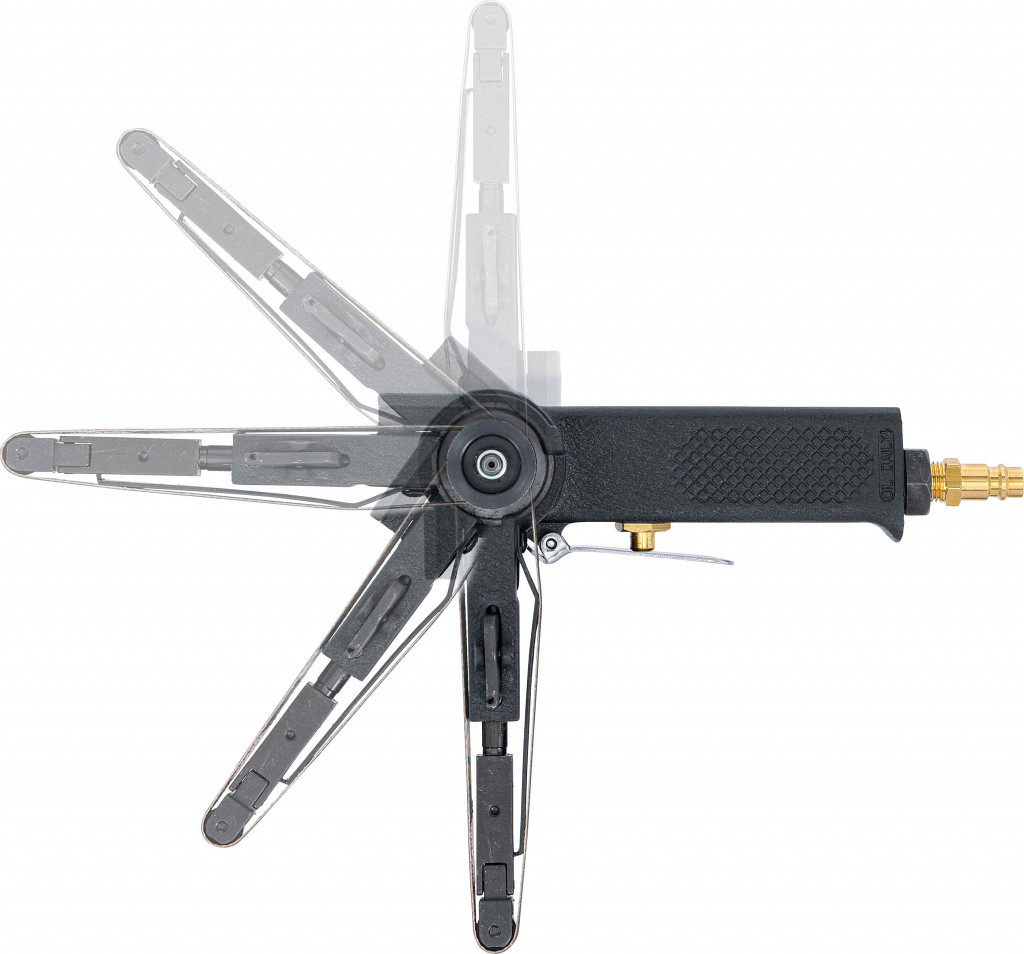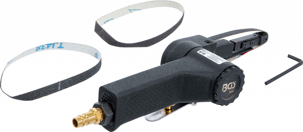 Pnevmatski brusilnik z brusnim trakom 330 x 10 mm za čiščenje manjših površin, kot so zavorne čeljusti, z nastavljivim kotom nagiba, hitrostjo do 20000 rpm, porabo 170 l/min, tlakom 6,3 bara, težo 1,2 kg in nivojem hrupa 93 dB(A).