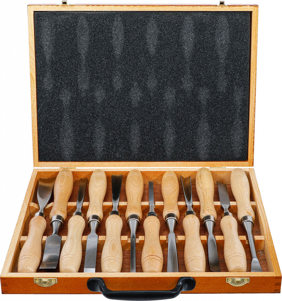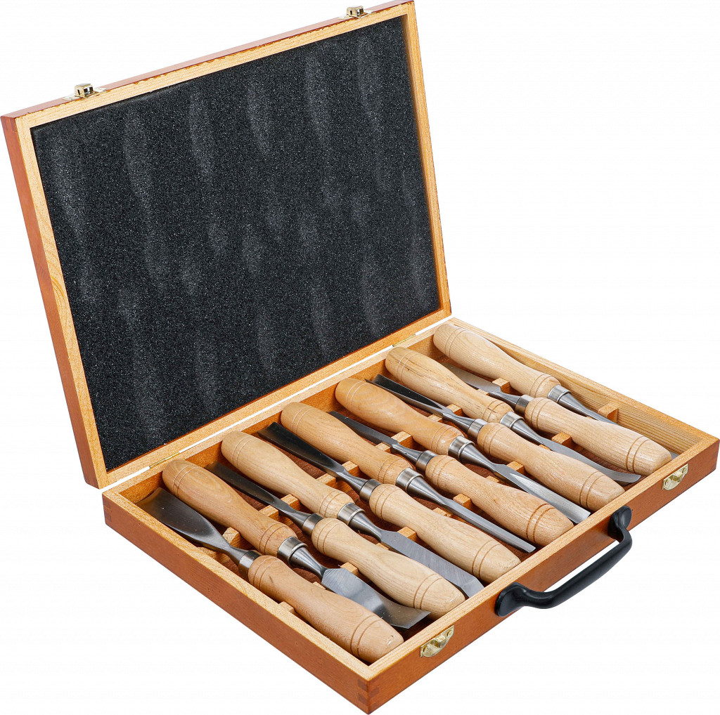 Iz visoko kakovostnega jekla, različne oblike konic za vse vrste uporabe, dolžina približno 225 mm, ergonomski leseni ročaji, v lesenem kovčku.