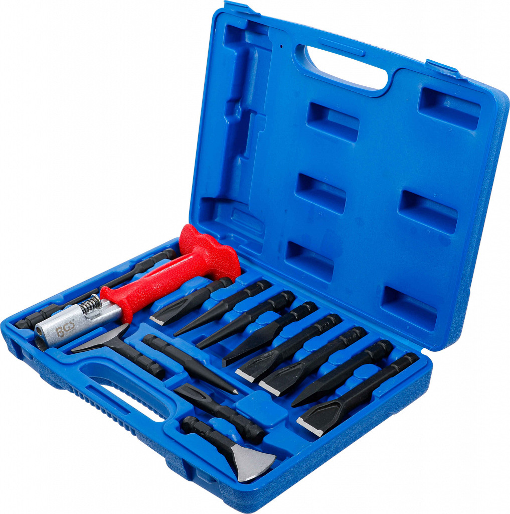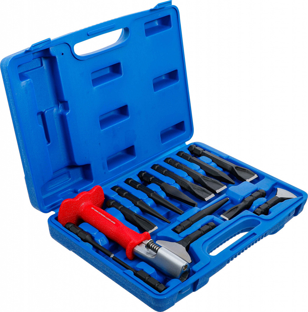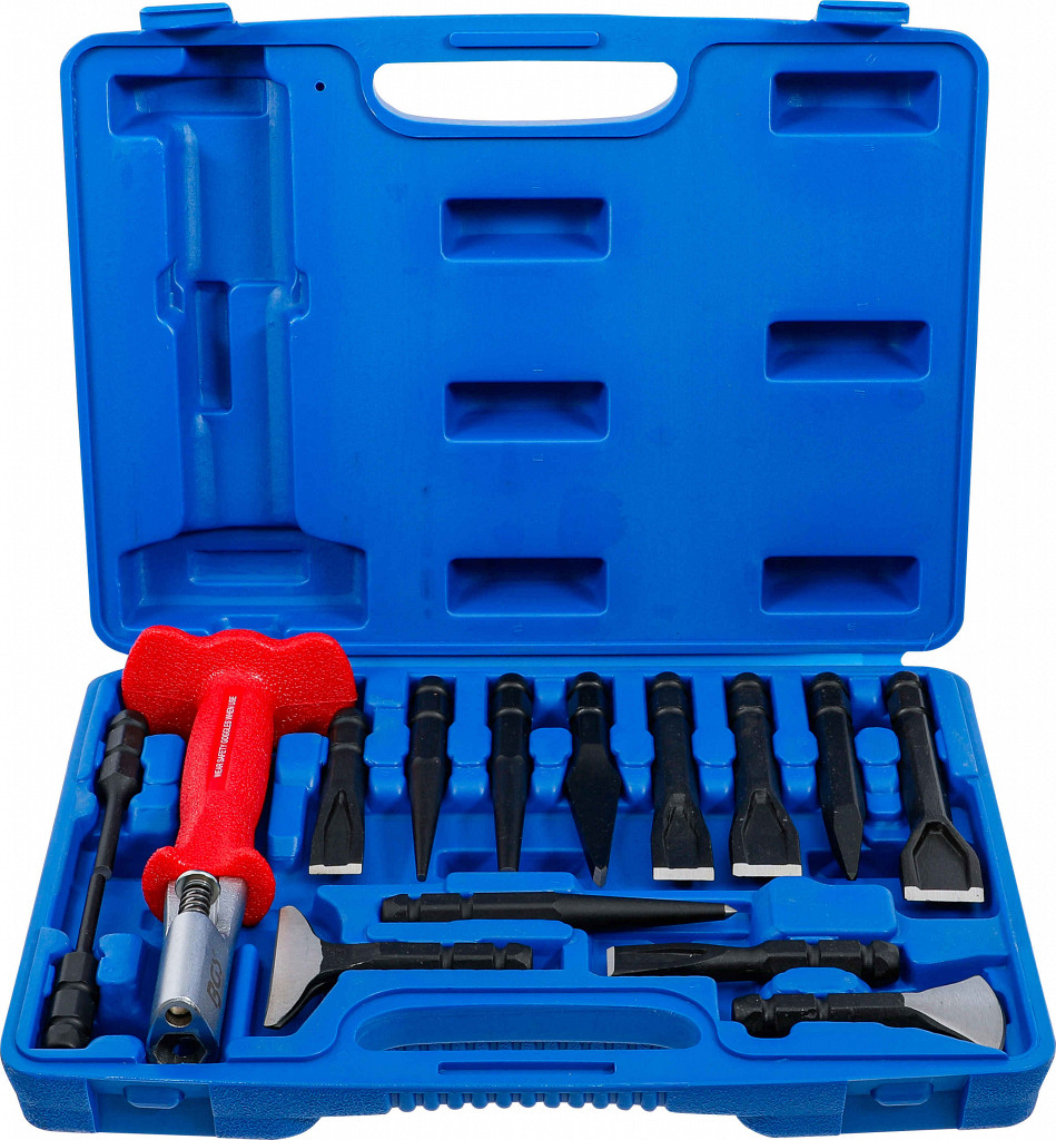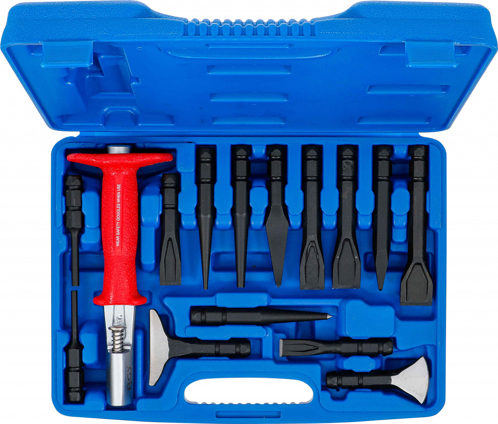 Ergonomsko oblikovan nedrseč gumiran ročaj, hitromenjalni ročaj iz krom-molibdenovega jekla. Vsebina: 7 ploščatih dleto, 1 prečno dleto, 1 točilo, 3...