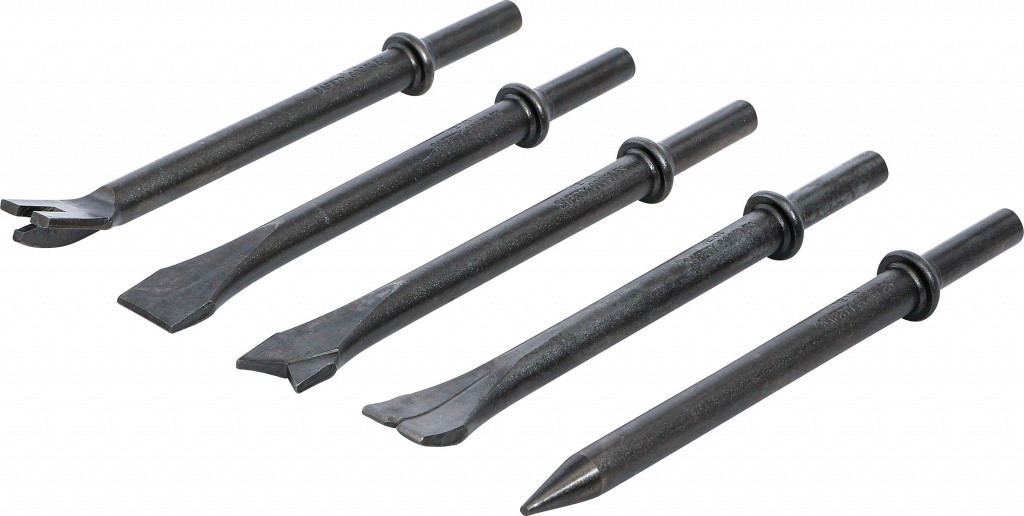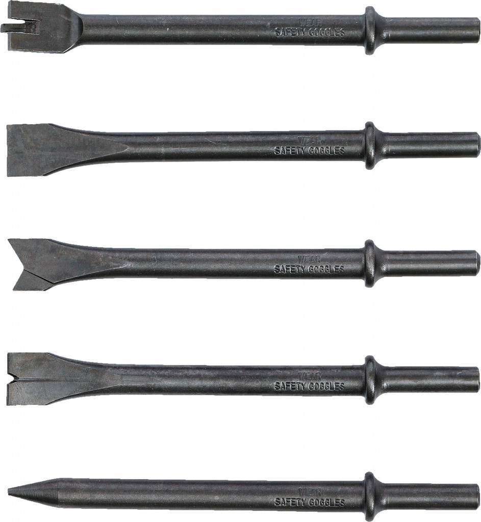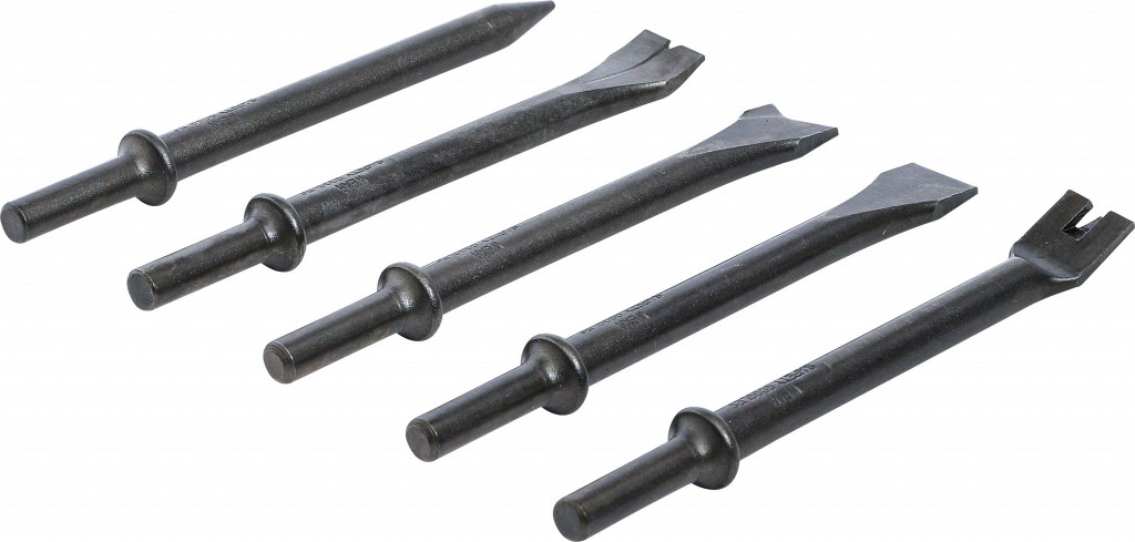 Komplet dlet za pnevmatska kladiva, vključno z ravnim dletom, dleto za točkovne zvare, dleto za cevi, robnim dletom in šilom, z okroglim steblom 10 mm.