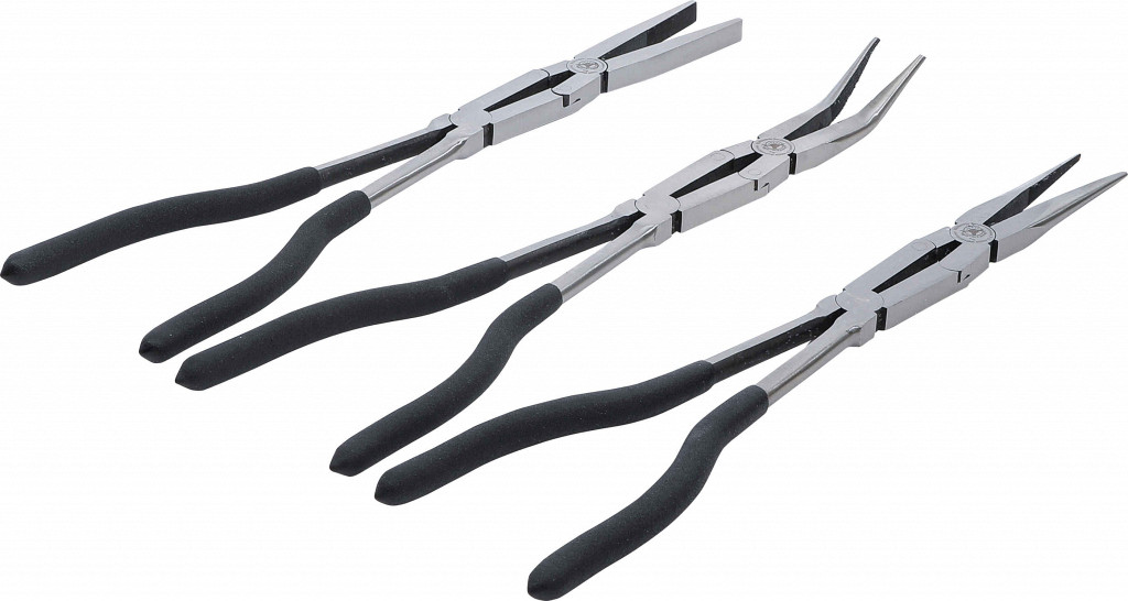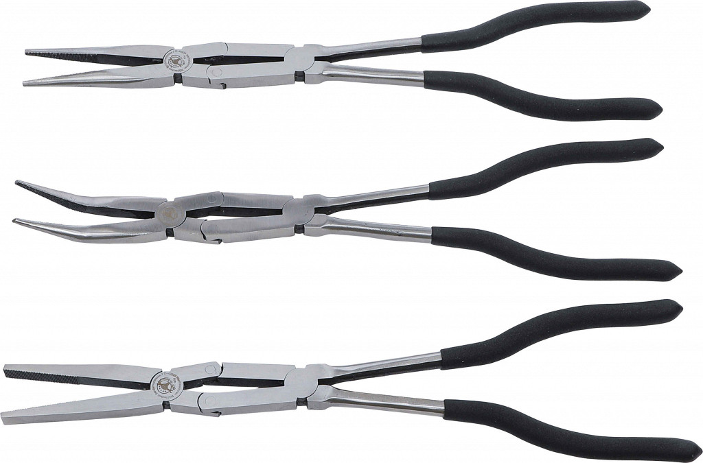 Zaradi dvojnega sklepa je možna velika odprtina klešč ob majhni odprtini ročajev; posebej primerne za delo v omejenih prostorih; ročaji z zaščitno plastjo, črni; pakirano v etuiju. Obseg dobave: klešče z dolgim nosom, ravne, dolžine 340 mm; klešče z dolgim nosom, rahlo ukrivljene, dolžine 335 mm; ravne ploščate klešče, dolžine 340 mm.