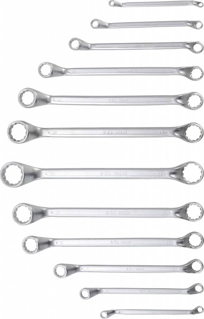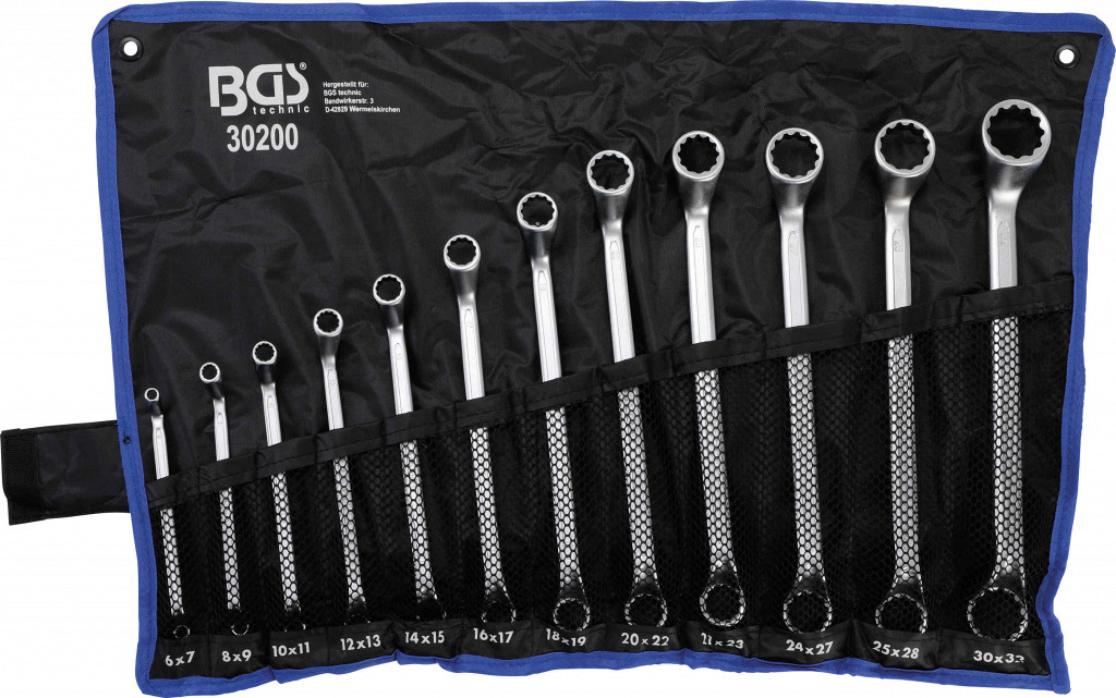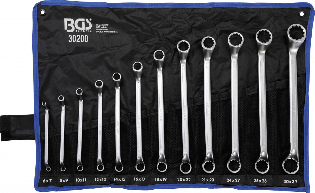 Hladno kovano, dolžina ključa, globoko zamaknjena obročna stran, profil 12-točkovni, pakirano v torbici iz tetronske tkanine. Vsebina: obročasti ključ z zamaknjenimi konci 6 x 7 mm, 8 x 9 mm, 10 x 11 mm, 12 x 13 mm, 14 x 15 mm, 16 x 17 mm, 18 x 19 mm, 20 x 22 mm, 21 x 23 mm, 24 x 27 mm, 25 x 28 mm, 30 x 32 mm.