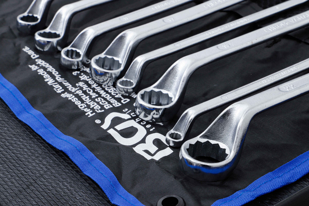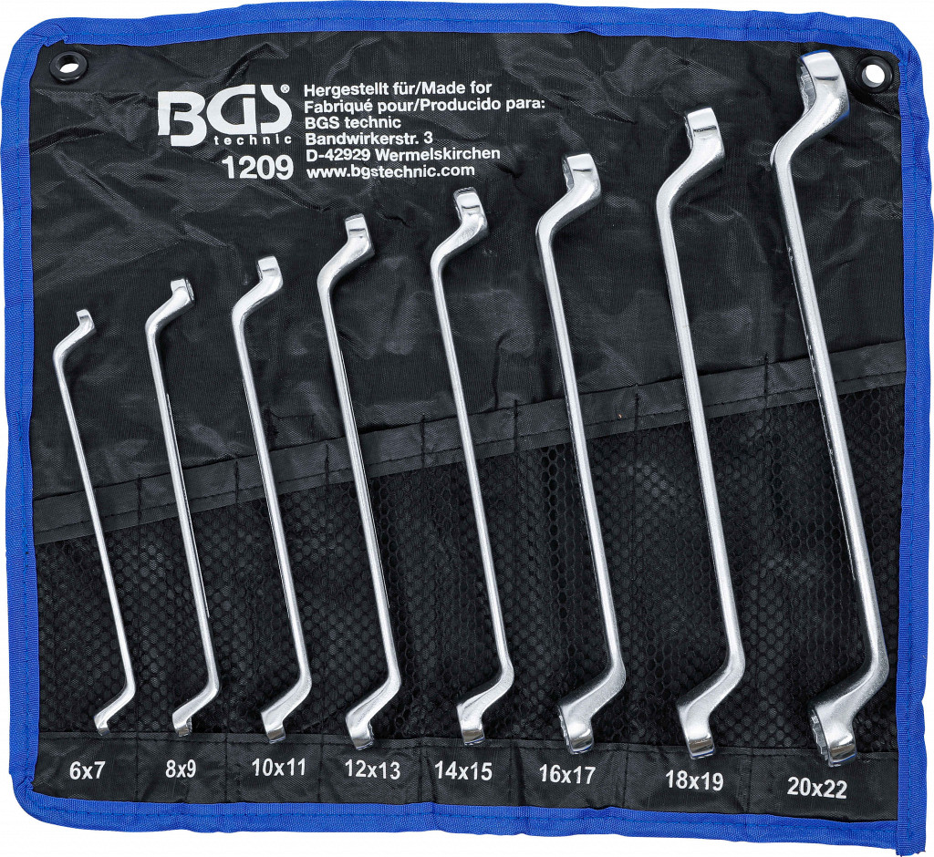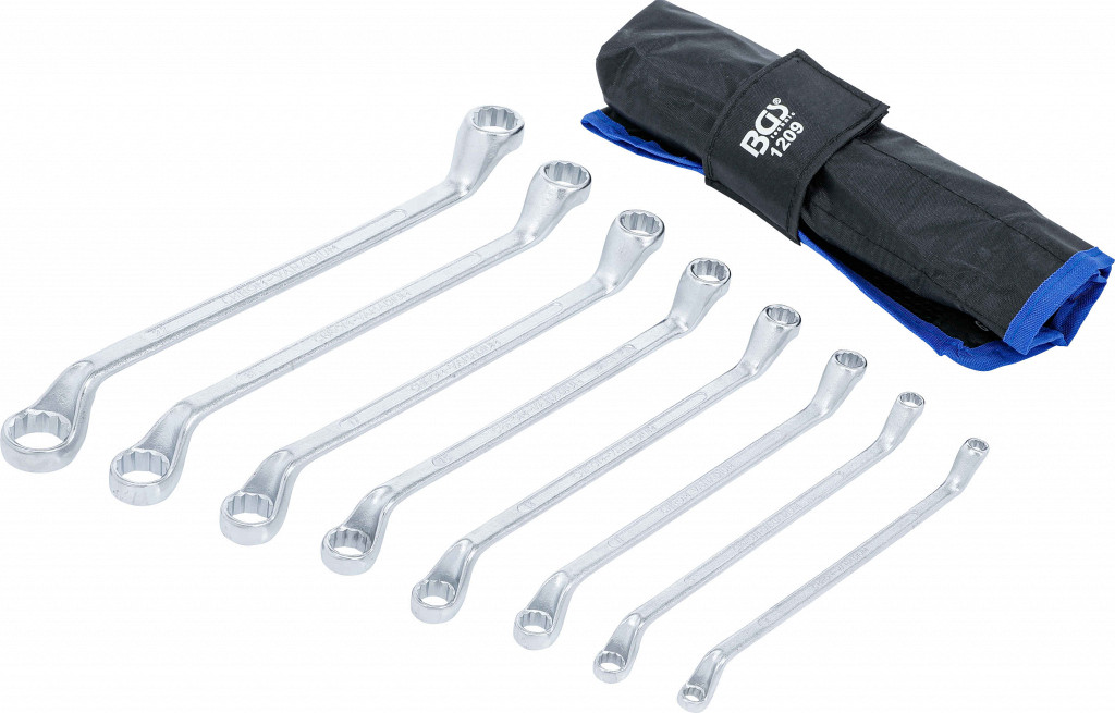 Vroče kovani, kromirani in polirani, z globoko zamaknjenim obročnim delom, 12-točkovni profil, pakirani v tetron etuiju. Obseg dobave: dvojni obročni ključi, globoko zamaknjeni, 6x7 mm, 8x9 mm, 10x11 mm, 12x13 mm, 14x15 mm, 16x17 mm, 18x19 mm, 20x22 mm.