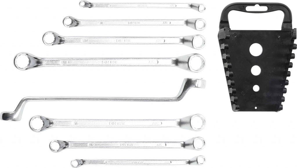 Vroče kovani, kromirani in polirani, globoko zamaknjen obročni del, 12-točkovni profil, v plastičnem stenskem nosilcu. Obseg dobave: dvojni obročni ključi...
