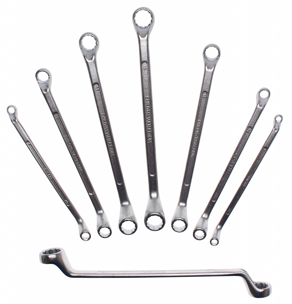 Vroče kovani, kromirani in polirani, globoko zamaknjen obročni del, 12-točkovni profil. Obseg dobave: dvojni obročni ključi, globoko zamaknjeni, 6x7, 8x9,...