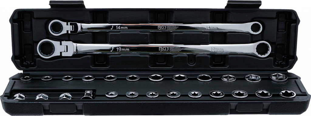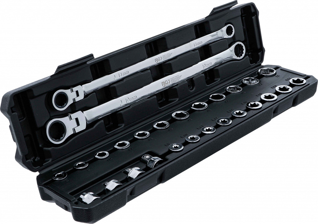 Združuje visoko natančnost in prilagodljivost v enem samem orodjukompaktna sestava12-točkovni izhodni profil vrtljivega ključa z zaskočno glavo je zasnovan za popoln prenos navora na glavi vijakaizjemno dolga ravna zasnova, za največji prenos moči, fino zobat s 72 zobilnim zaskočnim mehanizmom z zaskočnim kotom 5 ° z gladkimi, kromiranimi površinskimi vtičnicami, šesterokotni za fleksibilno privijanje matic na vijake in navojne paliceza prilagodljive možnosti uporabeza prilagodljiv komplet adapterjev za Ključi z zaskočnimi ključi s hitrim sprostitvijo lahko nadomestijo 3 ročaje, če se uporabljajo z zaskočnimi ključi. 1 dvojni obročni ključ in ključ z vrtljivo glavo | zelo dolg | 14 mm | 355 mm1 dvojni obročni ključ z vrtljivo glavo | zelo dolg | 19 mm | 395 mm1 prehodni vtični vložek, šesterokotnik | 8 mm1 prehodni vtični vložek, šesterokotnik | 9 mm1 prehodni vtični vložek, šesterokotnik | 10 mm1 prehodni vtični vložek, šesterokotnik | 11 mm1 vtičnica, šesterokotnik | 12 mm1 prehodni vtični vložek, šesterokotnik | 13 mm1 prehodni vtični vložek, šesterokotnik | 15 mm1 prehodni vtični vložek, šesterokotnik | 16 mm1 prehodni vtični vložek, šesterokotnik | 17 mm1 vtičnica, šesterokotna | 18 mm1 prehodni vtični vložek, šesterokotnik | 21 mm1 vtičnica, šesterokotna | 22 mm1 prehodni vtični vložek, E-tip | E81 vtičnica, tip E | E101 vtičnica, E-tip | E111 vtičnica, E-tip | E121 vtičnica, E-tip | E141 vtičnica, tip E | E161 vtični vložek, E-tip | E181 vtičnica, E-tip | E201 vtičnica, tip E | E221 adapter z zunanjim kvadratnim 6,3 mm (1/4") za obročkasti ključ 19 mm1 adapter z zunanjim kvadratom 10 mm (3/8") za obročkasti ključ 19 mm1 adapter z zunanjim kvadratom 12,5 mm (1/2") za obročkasti ključ 19 mm1 bitni adapter z notranjim šesterokotnikom 6,3 mm (1/4") za obročkasti ključ 19 mm