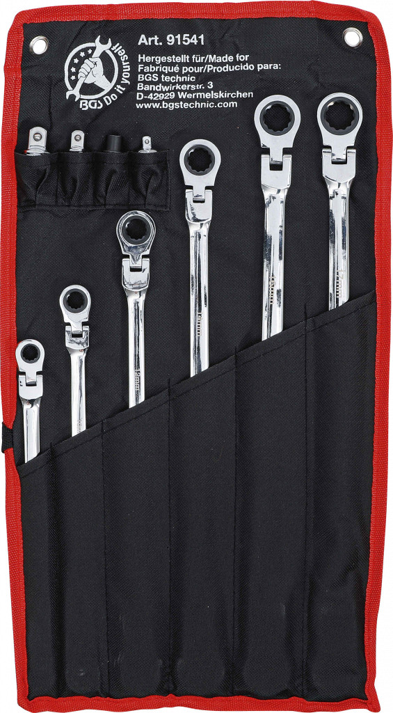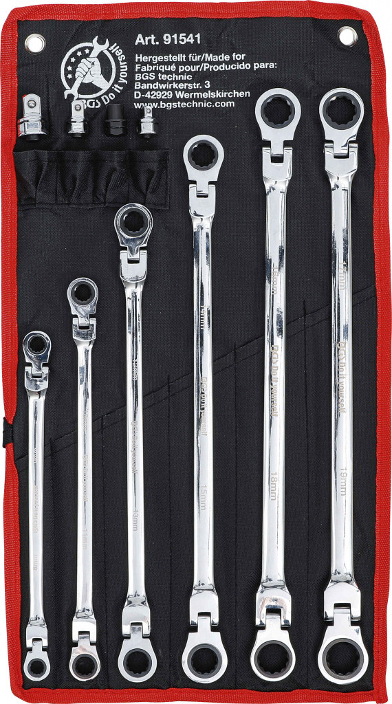 Ekstra dolgo hladno kovana s spojem, fleksibilne glave, nastavljive za 90 ° v tetronski denarnici. 1 ključ z dvojno vrtljivo glavo, pogon: 12-točkovni, 8 x 9 mm, dolžina: 245 mm1 ključ z dvojno vrtljivo glavo, pogon: 12-točkovni, 10 x 11 mm, dolžina: 280 mm1 ključ z dvojno vrtljivo glavo, pogon: 12-točkovni, 12 x 13 mm, dolžina: 340 mm1 ključ z dvojno vrtljivo glavo, pogon: 12-točkovni, 14 x 15 mm, dolžina: 380 mm1 ključ z dvojno vrtljivo glavo, pogon: 12-točkovni, 16 x 18 mm, dolžina: 410 mm1 ključ z dvojno vrtljivo glavo, pogon: 12-točkovni, 17 x 19 mm, dolžina: 415 mm3 adapterji za vtične ključe:. Zunanji šesterokotni 14 mm pogon - zunanji kvadratni 6,3 mm (1/4") pogon zunanji šesterokotnik 14 mm pogon - zunanji kvadratni 10 mm (3/8") pogon zunanji šesterokotnik 19 mm pogon - zunanji kvadratni 12,5 mm (1/2") pogon.1 bitni adapter, magnetni, 14 mm pogon, šesterokotnik 6,3 mm (1/4") pogon