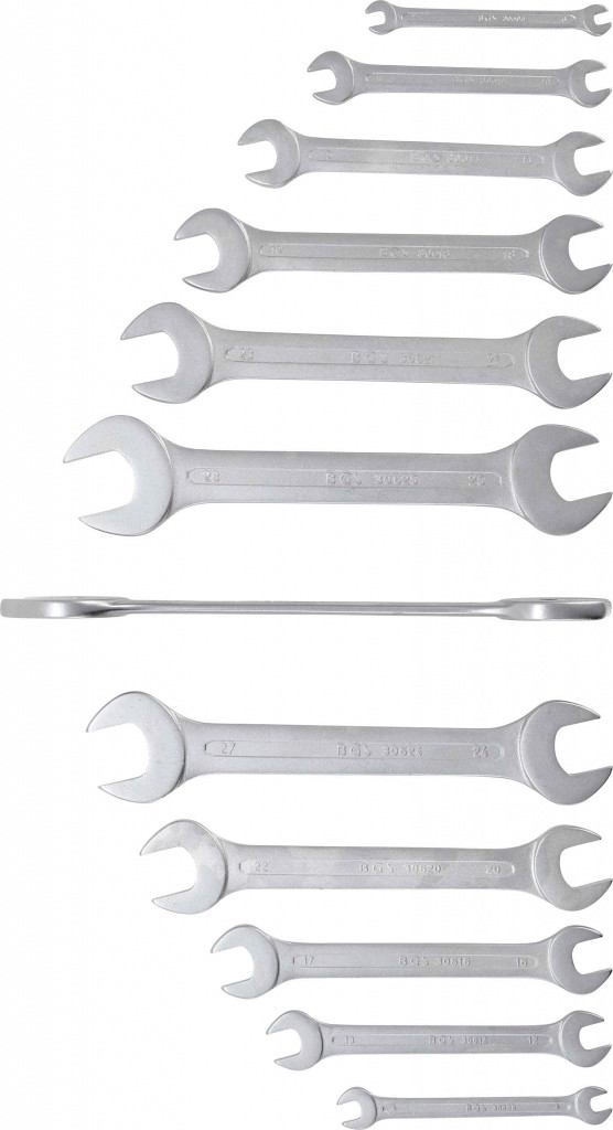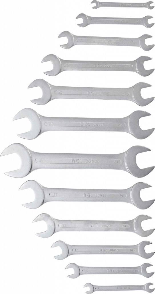 Hladno kovano, satenasto kromirano, pakirano v tetron etuiju. Vsebina: dvostranski vilasti ključi 6 x 7 mm, 8 x 9 mm, 10 x 11 mm, 12 x 13 mm, 14 x 15 mm, 16 x 17 mm, 18 x 19 mm, 20 x 22 mm, 21 x 23 mm, 24 x 27 mm, 25 x 28 mm, 30 x 32 mm.