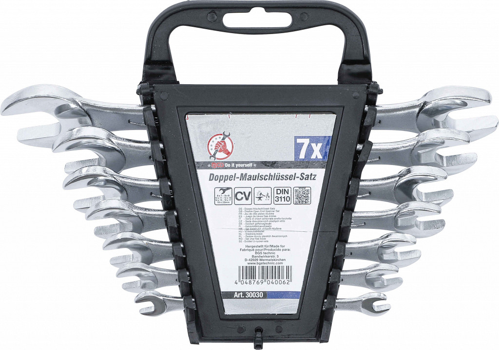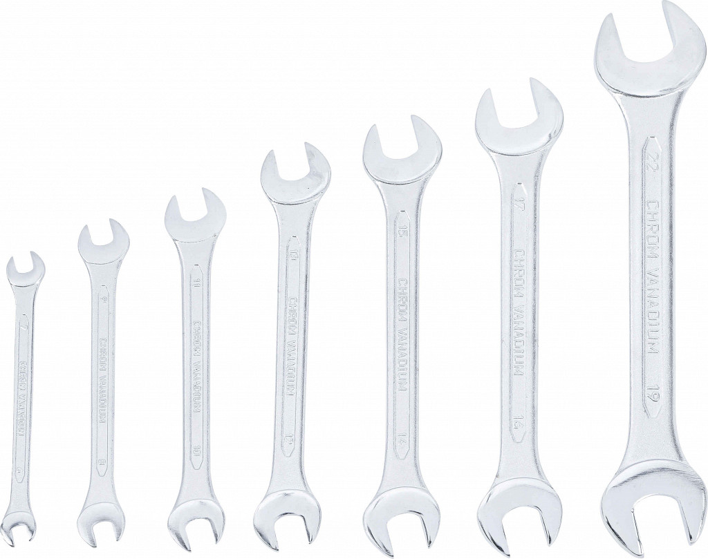 Vroče kovano, kromirano, z visoko poliranimi glavami, v plastičnem držalu z ročajem. Obseg dobave: dvostranski vilasti ključi 6 x 7 mm do 19 x 22 mm.