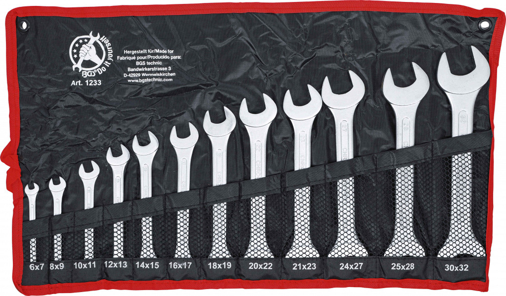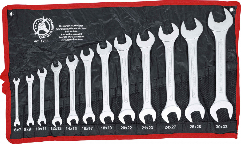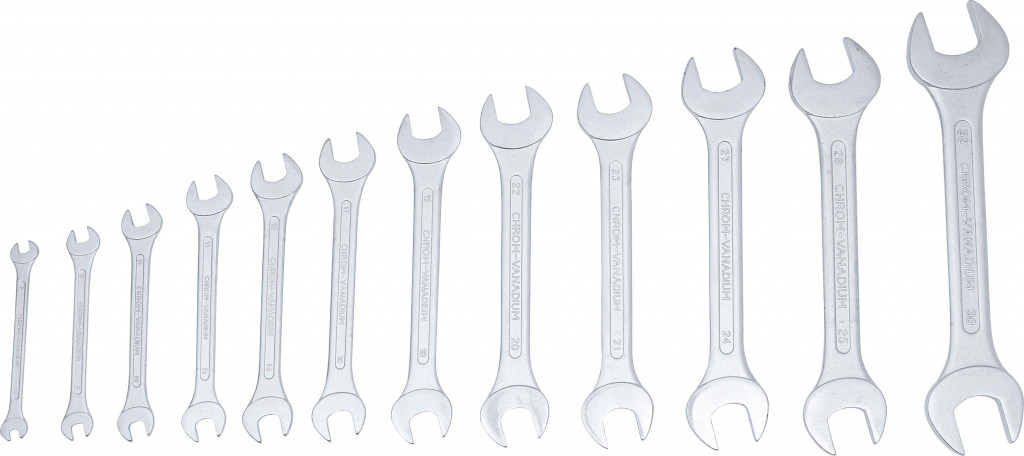Kovano; saten kromirano; v tetron etuiju; vsebina: dvojni viličasti ključi 6×7, 8×9, 10×11, 12×13, 14×15, 16×17, 18×19, 20×22, 21×23, 24×27, 25×28, 30×32 mm.