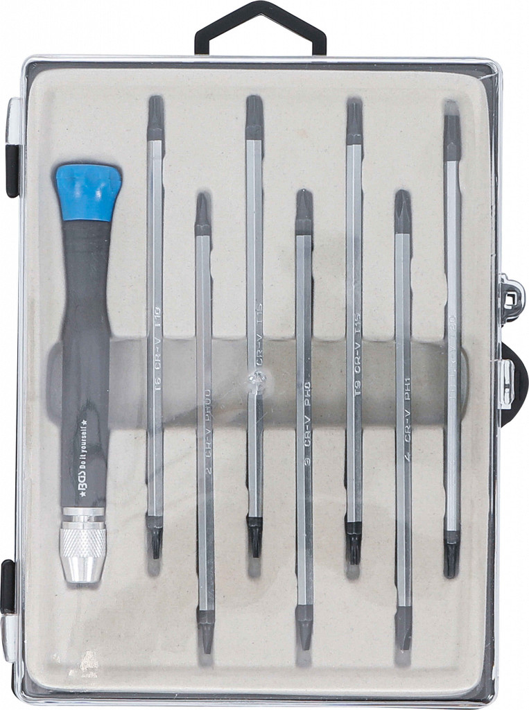 Natančni izvijač z 7 zamenljivimi dvojnimi rezili v plastičnem kovčku. Vsebina: Torx T6–T20, PH/SL kombinacije.
