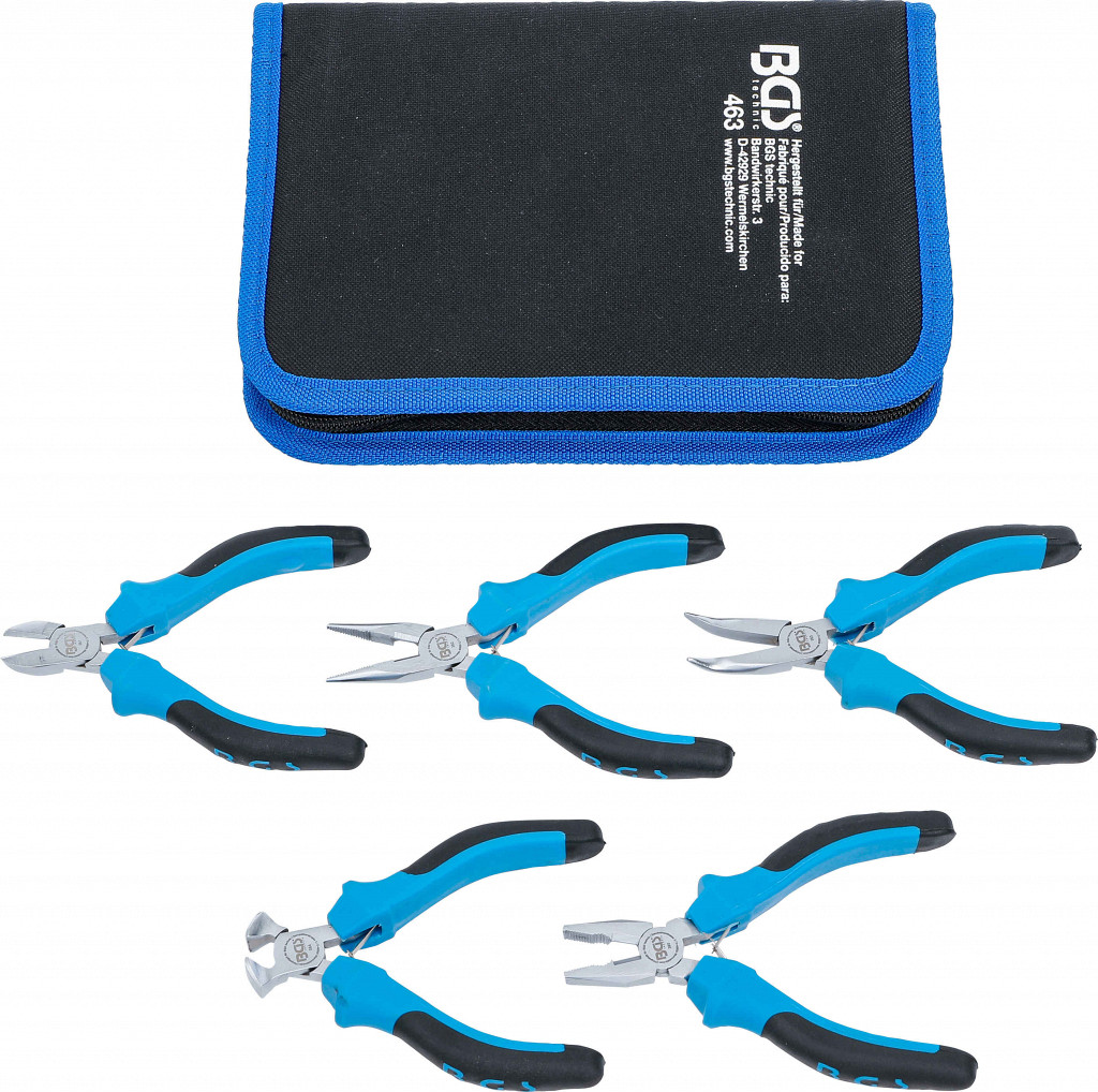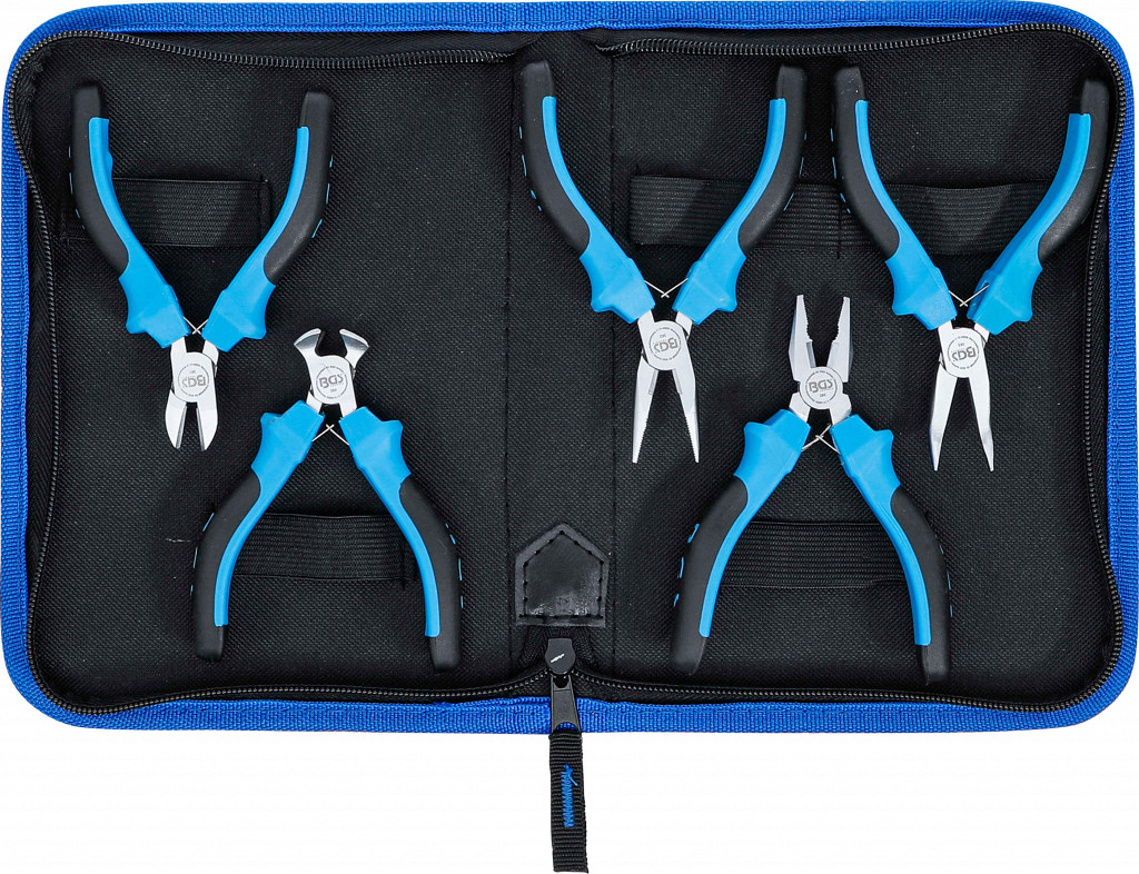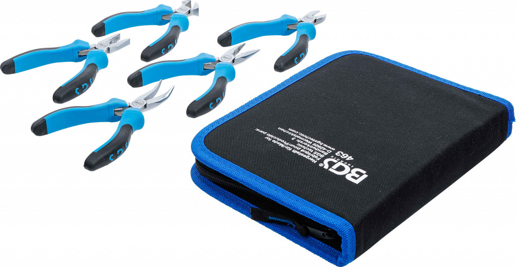 Klešče z dvojnimi vzmetmi in izoliranimi loki iz plastike, v črni torbici na zadrgo. Vsebina: kombinirane klešče 120 mm, stranske klešče 115 mm, ravne dolgonosne klešče 130 mm, ukrivljene dolgonosne klešče 125 mm, čelne klešče 105 mm.