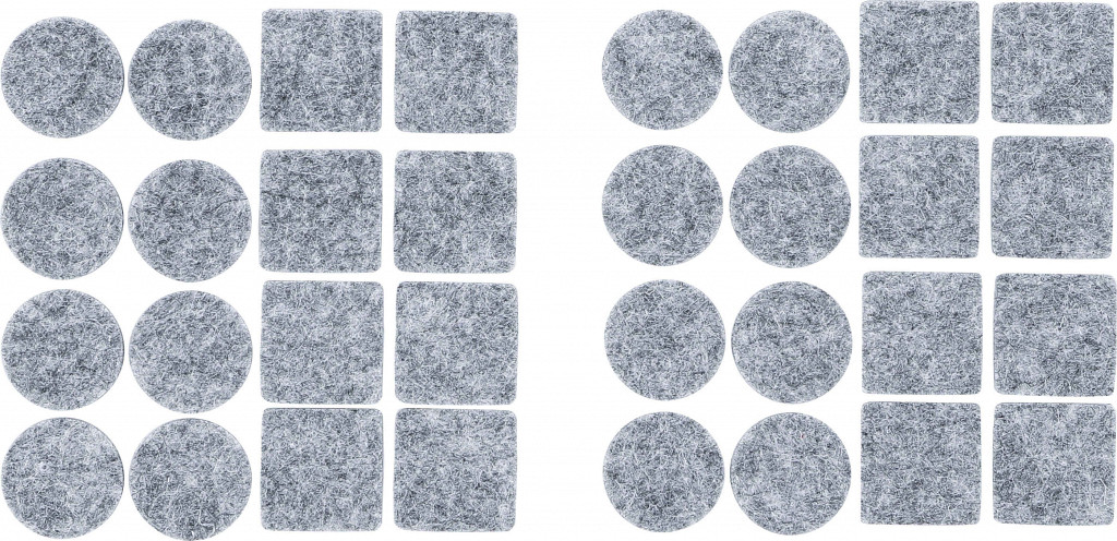 Samolepilna drsna pomoč in zvočna izolacija za stole in druge majhne dele pohištvaprijazna do tal za premikanje pohištva na vseh trdih, gladkih talnih površinahza zaščito gladkih površin, kot so laminat, parket, sintetični material ali kamnita tla, primerna tudi za predmete, kot so zvočniške škatle, svetilke ali dekorativni predmeti, ki se uporabljajo na čistih, suhih in nemastnih površinah. 16 blazinic, okrogle, Ø 22 mm16 klobučevine Blazinice, kvadratne, 22 x 22 mm