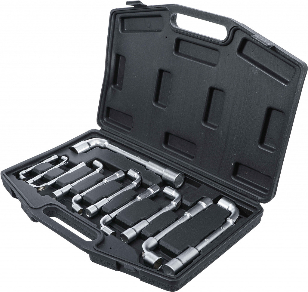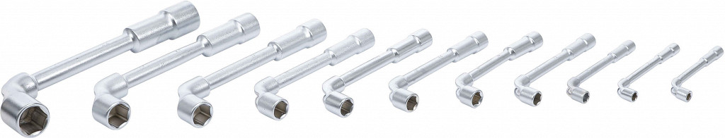 Oba konca imata šesterokotne nasadne glave, vsak ključ ima raven in upognjen konec. Obseg dobave: L-ključ nasadni 6 mm, 7 mm, 8 mm, 10 mm, 11 mm, 12 mm, 13 mm, 14 mm, 17 mm, 19 mm, 22 mm.