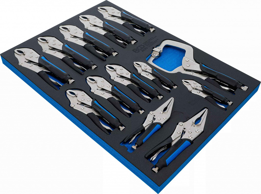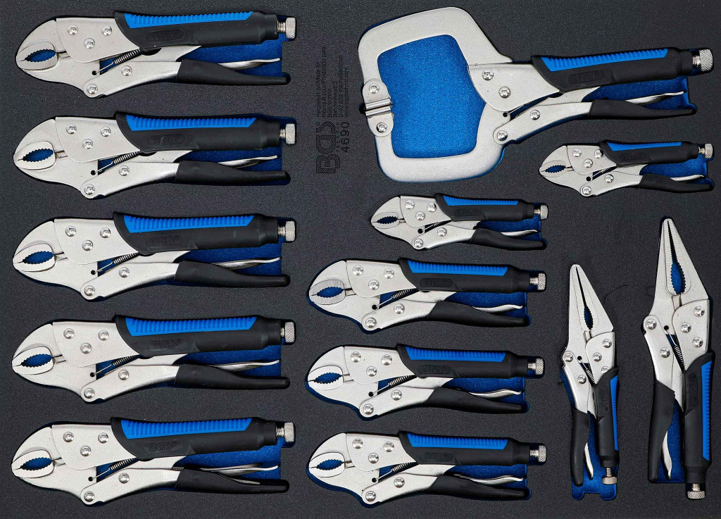 Komplet 13 vpenjalnih klešč za karoserijska dela, z ergonomskimi ročaji, hitro sprostitvijo in penastim pladnjem. Vsebina: 3 okrogle klešče, 5 velikih, 2...