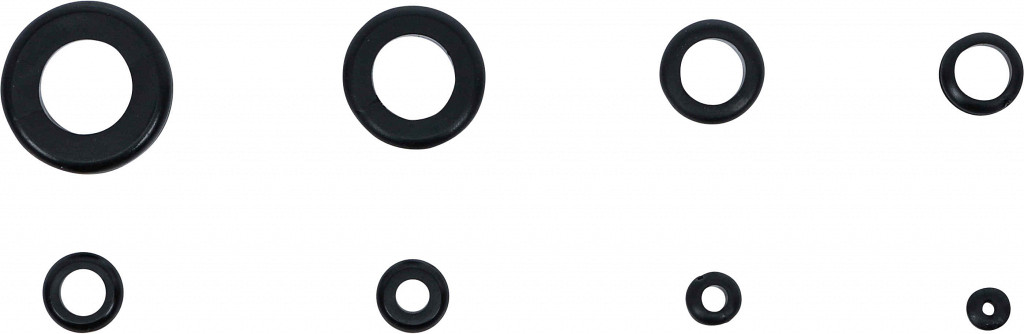 Komplet gumijastih tesnilnih vložkov za zaščito kablov pri polaganju skozi pločevino ali plastiko: 5 kosov izvrtina Ø 22 mm kabel Ø 15 mm, 5 kosov izvrtina Ø 15,5 mm kabel Ø 12 mm, 5 kosov izvrtina Ø 28 mm kabel Ø 17 mm, 20 kosov izvrtina Ø 12 mm kabel Ø 11 mm, 25 kosov izvrtina Ø 11 mm kabel Ø 9 mm, 40 kosov izvrtina Ø 10 mm kabel Ø 6 mm, 40 kosov izvrtina Ø 7,5 mm kabel Ø 5 mm, 40 kosov izvrtina Ø 6 mm kabel Ø 3 mm.
