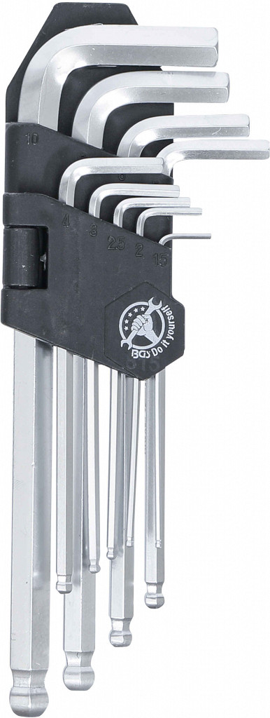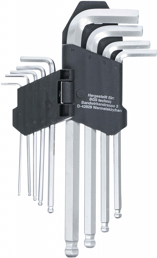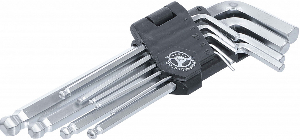 Komplet dolgih L-klučev imbus z kroglično konico v držalu. Vsebina: 1,5–10 mm.