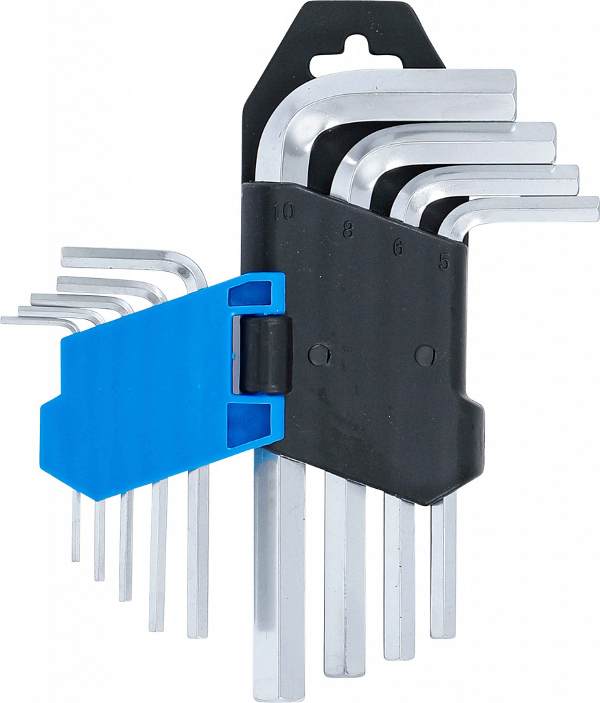 Komplet kratkih L-klučev imbus v zložljivem držalu. Vsebina: 1,5–10 mm.