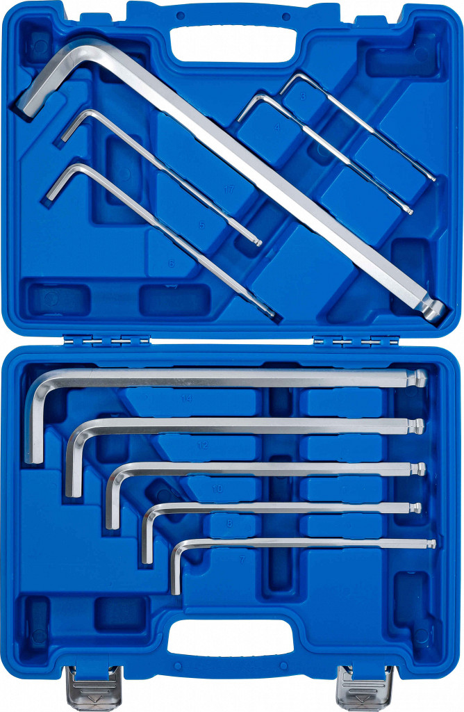 Komplet L-klučev imbus, ponikljani, dolga izvedba, s kroglično konico. Vsebina: 3–17 mm.