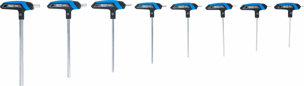 Dvosmerna uporaba, kratek in dolg steblo, ergonomski ročaj, kovinsko stojalo z montažnimi luknjami. Vsebina: T-ročni ključ imbus 2 x 90 mm, 2.5 x 100 mm, 3 x 115 mm, 4 x 120 mm, 5 x 140 mm, 6 x 160 mm, 8 x 175 mm, 10 x 200 mm.