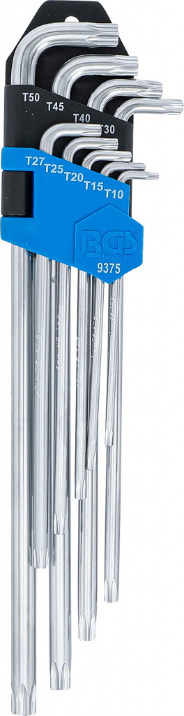 Komplet Torx ključev v zložljivem držalu, dolga stran normalna, kratka izredno kratka, velikosti T10–T50 z navedbo dolžin posameznih rezil.