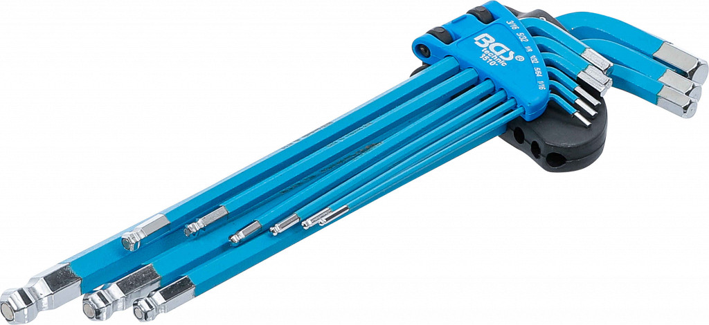 Set imbus ključev z barvno oznako proti drsenju, dolgi krak s kroglično glavo in magnetom, v zložljivem držalu, colske mere 1/16" do 3/8".