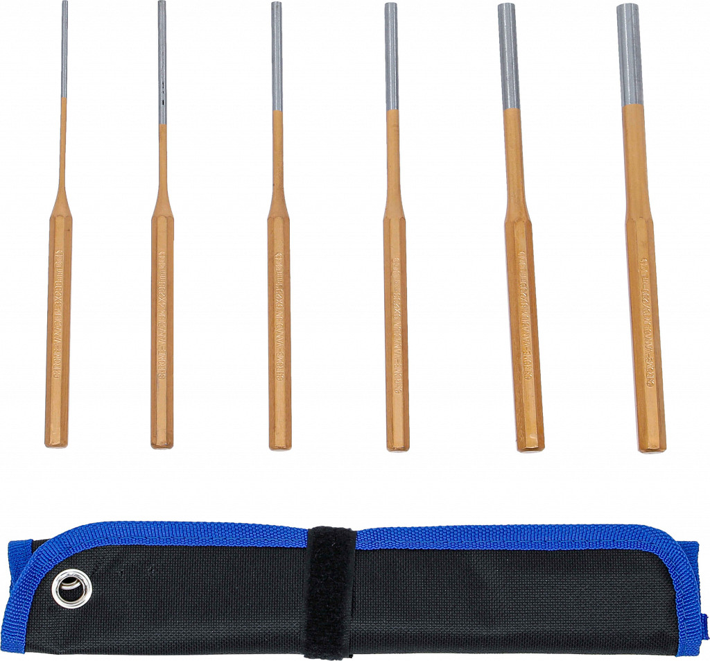 S šesterokotnim vpenjalnim delom, kaljeno, dolžina 200 mm, v torbici. Vsebina: izbijala 200 mm, 3 - 4 - 5 - 6 - 8 - 10 mm.