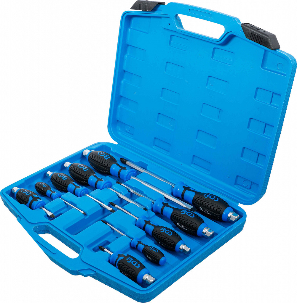 Kombiniran set izvijačev za križne PH in ravne SL vijake, delno s prebojnim rezilom in zunanjim šesterokotnikom za uporabo z ključem, magnetne konice, ergonomski mehki ročaj, označbe velikosti na ročaju. Dobava vključuje izvijače SL 3.2–8 mm in PH0–PH3 v različnih dolžinah.